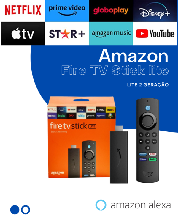 O controle remoto que acompanha o Amazon Fire TV Stick Lite é conhecido como Alexa Voice Remote Lite. Esse controle remoto é mais simplificado quando comparado ao controle remoto que acompanha as versões mais avançadas do Fire TV Stick.